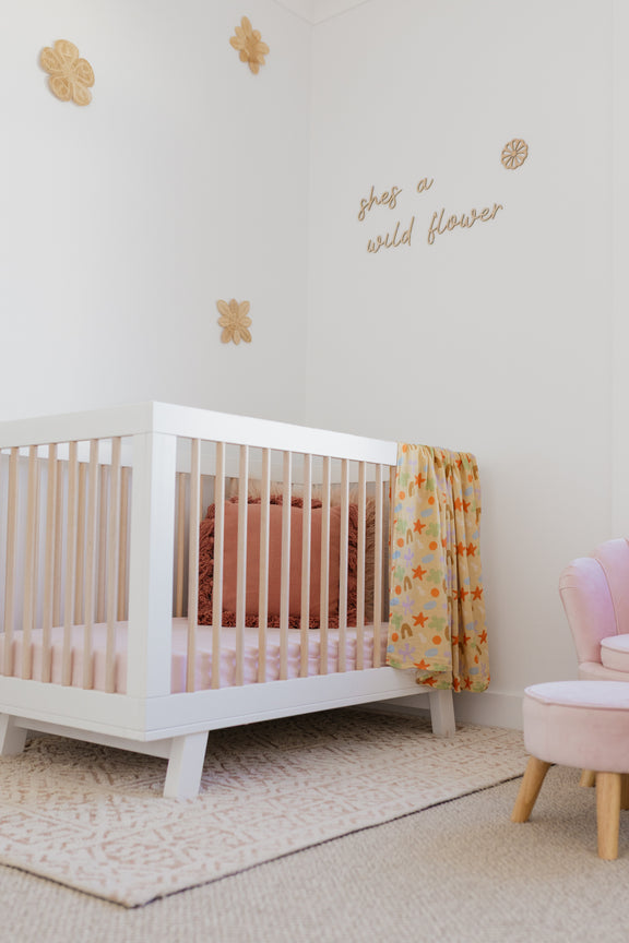 Its playful pattern, a joyful dance of stars, crescents, florals, and abstract shapes evokes the magic of childhood curiosity. Set against a warm neutral base, the vibrant palette of orange, purples, greens, and blues brings a touch of whimsy to any nursery.