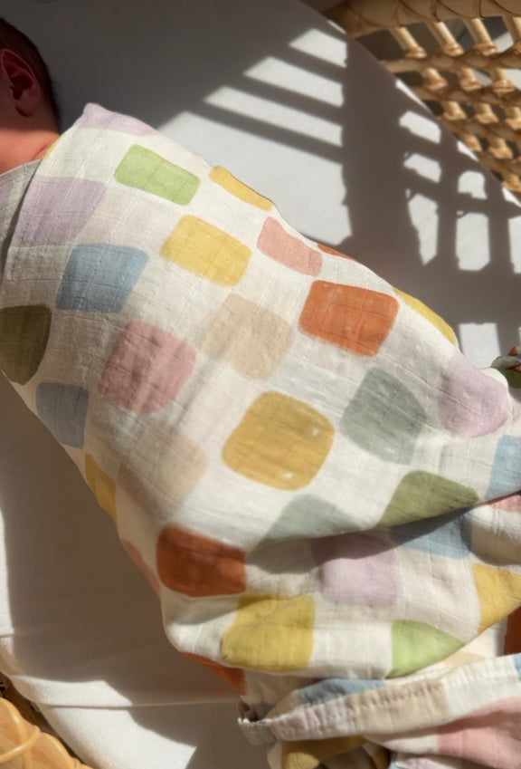 Crafted from breathable, lightweight bamboo cotton muslin, this swaddle is designed to soothe delicate skin while offering versatility for every moment—swaddling, nursing, stroller naps, or quiet cuddles. The design evokes a sense of order and play, like building blocks of love and discovery.