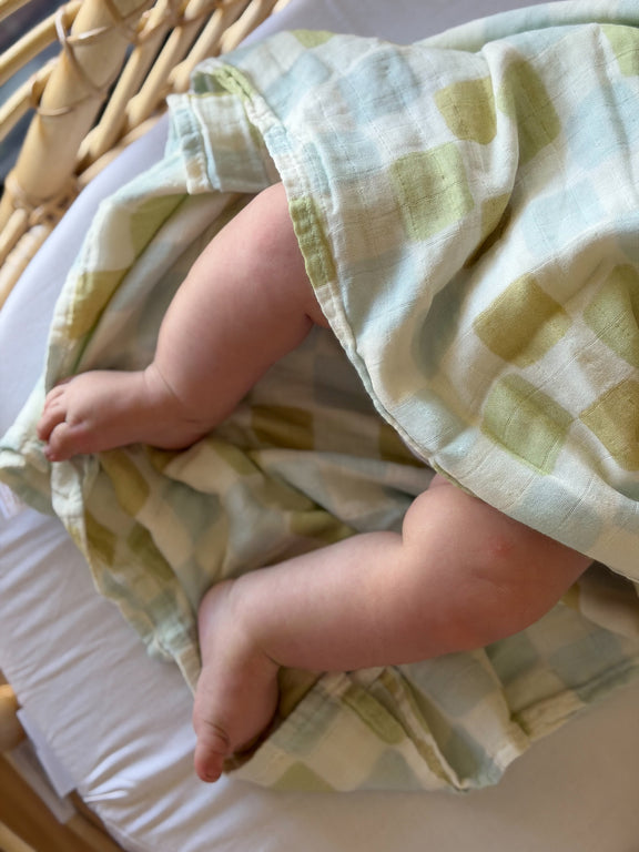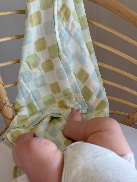 The Seafoam Patch muslin swaddle wraps your little one in a soft mosaic of pastel serenity. Its delicate grid of seafoam green and layered blues — from misty to deep — evokes the calming rhythm of ocean tides and open skies, offering a design that feels both timeless and tender.