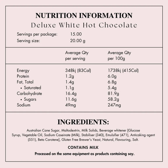 Our Deluxe White Hot Chocolate drink powder comes with BONUS two recipes - Dreamy Iced White Frappe and White Mocha Magic.